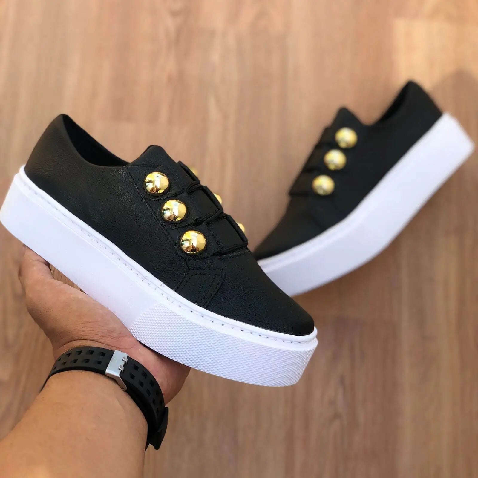 Zapatillas negras para mujer con plataforma blanca, diseño moderno y detalles metálicos dorados, ideales para uso casual y urbano, cómodas, livianas y resistentes, perfectas para combinar con jeans y ofrecer estilo y confort durante todo el día.