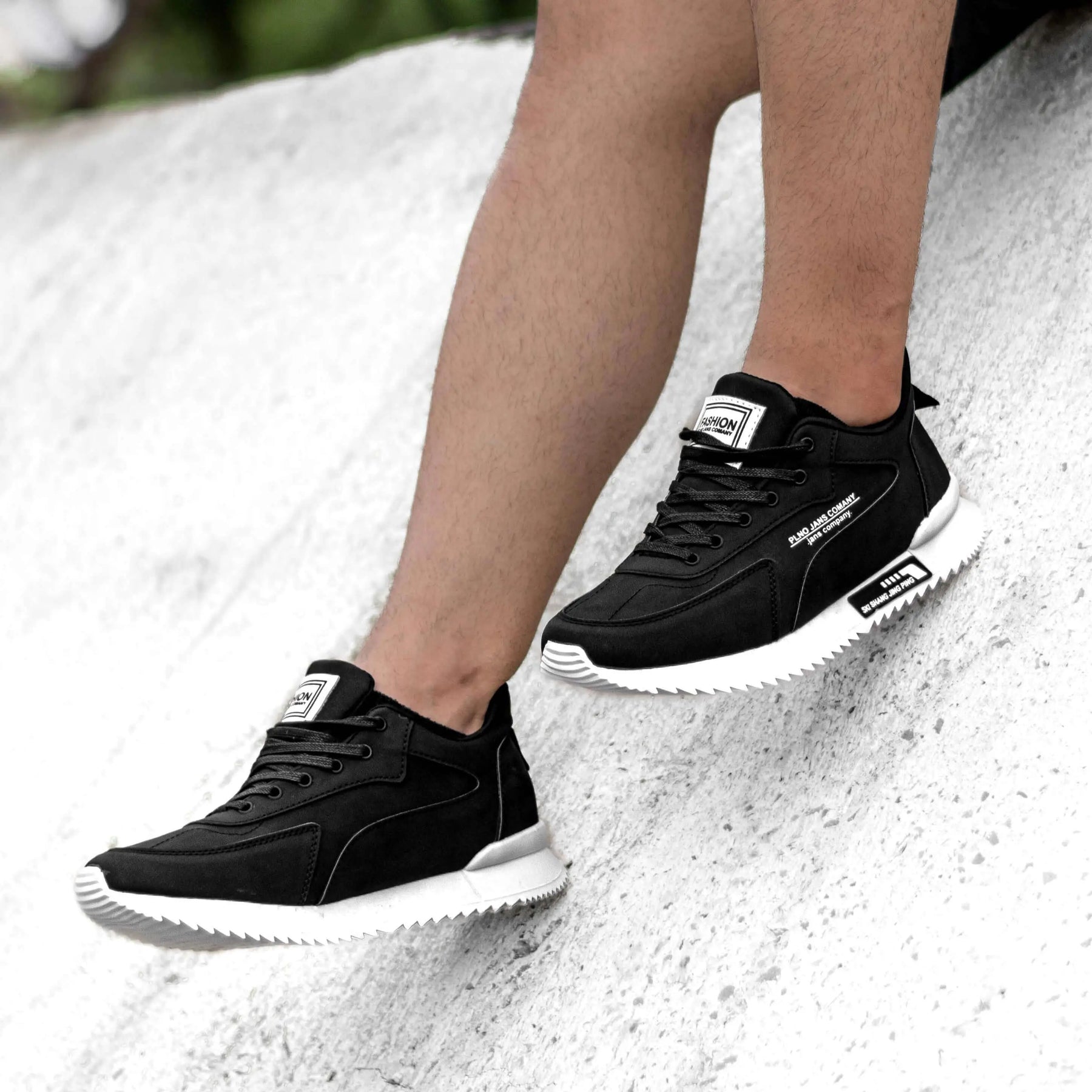 Zapatillas negras para hombre con diseño moderno y cómodo, suela blanca antideslizante y materiales transpirables que ofrecen confort para uso diario y actividades deportivas. Calzado ligero y duradero ideal para caminar y entrenar con estilo.